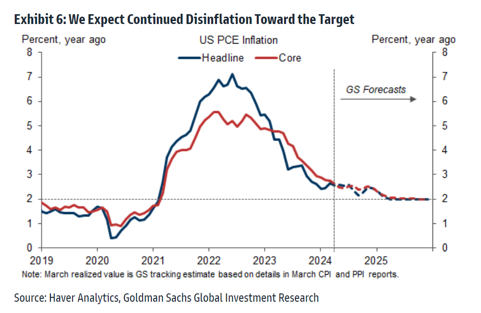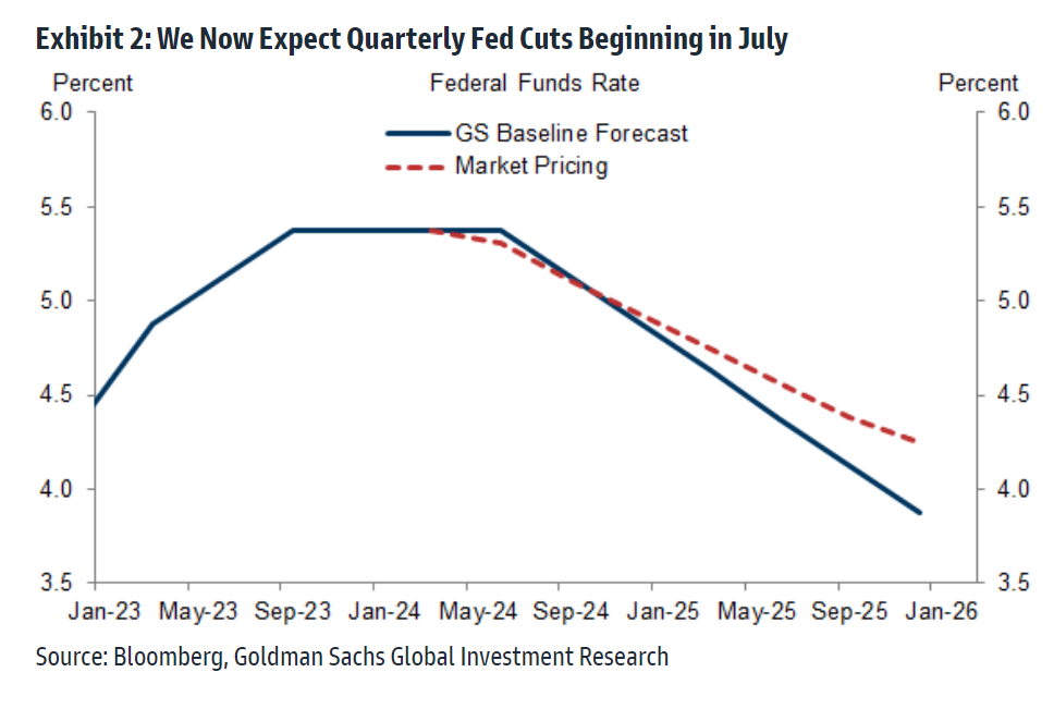 Η οικονομία των ΗΠΑ θα πρέπει να είναι σε θέση να αντέξει μια μεταγενέστερη του αναμενόμενου έναρξη της νομισματικής χαλάρωσης. Παρόλο που η αύξηση του ΑΕΠ έχει επιβραδυνθεί από τον υψηλό ρυθμό 4,1% του 2023 στο β’ εξάμηνο, η Goldman Sachs εκτιμά ότι το α’ τρίμηνο θα σημειώσει σταθερή αύξηση 3,1%, καθοδηγούμενη και πάλι από την ισχύ της προσωπικής κατανάλωσης. Παρομοίως, τα νέα για την αγορά εργασίας παραμένουν ως επί το πλείστον ευνοϊκά.