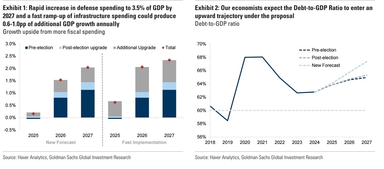 «Οι γερμανικές και οι αμυντικές μετοχές σημείωσαν ιδιαίτερη υπεραπόδοση. Ενώ το ανοδικό περιθώριο στις ευρωπαϊκές μετοχές παραμένει, οι κίνδυνοι περιλαμβάνουν την επιβράδυνση της ανάπτυξης στις ΗΠΑ και την αύξηση των αποδόσεων των ομολόγων. Οι συστάσεις μας περιλαμβάνουν θέσεις long στην άμυνα και τις δημοσιονομικές υποδομές», συνεχίζει η αμερικανική επενδυτική τράπεζα.
