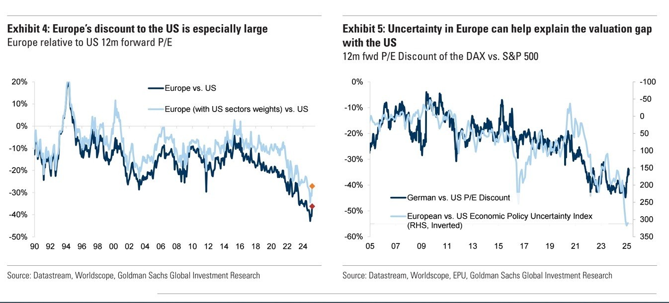 «Το δημοσιονομικό πακέτο είναι πιθανός καταλύτης για την ευρωπαϊκή οικονομία αλλά και τις ευρωπαϊκές μετοχές, καθώς περιλαμβάνει ένα ταμείο υποδομών ύψους 500 δισ. ευρώ και απαλλαγές από τις αμυντικές δαπάνες, αυξάνοντας δυνητικά το ΑΕΠ κατά 0,2-1,0 ποσοστιαίες μονάδες ετησίως, ανάλογα με την ταχύτητα εφαρμογής. Πέρα από την άμεση κυβερνητική στήριξη, μια αλλαγή στη ρητορική σχετικά με την αναπτυξιακή αφήγηση της Ευρώπης θα μπορούσε να ενισχύσει σημαντικά τις αποτιμήσεις. Οι ευρωπαϊκές μετοχές έχουν επαναξιολογηθεί από κάτω από τον ιστορικό μέσο όρο τους πέρυσι σε 14,2 φορές σε όρους P/E σήμερα. Η Γερμανία εξακολουθεί να διαπραγματεύεται με έκπτωση 35% σε όρους P/E σε σχέση με τις ΗΠΑ. Αυτή η διαφορά οφείλεται σε μεγάλο βαθμό στις διαφορές στην αβεβαιότητα της οικονομικής πολιτικής. Σύμφωνα με το μοντέλο αποτίμησής μας, αν ο ευρωπαϊκός δείκτης αβεβαιότητας για την οικονομική πολιτική (EPU) μειωνόταν σε επίπεδο παρόμοιο με το σημερινό EPU των ΗΠΑ, αυτό θα σήμαινε πιθανή ενίσχυση των ευρωπαϊκών αποτιμήσεων κατά 20%», καταλήγει η αμερικανική επενδυτική τράπεζα.