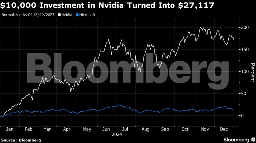 Ενώ ο ενθουσιασμός για τις δυνατότητες της τεχνητής νοημοσύνης ανέβασε συνολικά τον τεχνολογικό τομέα της αμερικανικής megacap, η κατασκευάστρια τσιπ Nvidia ήταν ο ξεκάθαρος νικητής μεταξύ των μεγάλων ονομάτων, μετατρέποντας 10.000 δολάρια σε 27.117 δολάρια. Αντίθετα, η Microsoft έμεινε πίσω, προσθέτοντας 1.209 δολάρια σε μια τέτοια επένδυση.