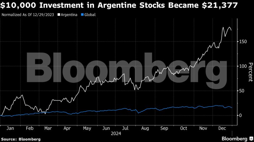 Ο δείκτης S&P Merval της Αργεντινής ήταν μακράν ο δείκτης με την καλύτερη απόδοση σε μια ομάδα 92 πρωτογενών μετοχικών δεικτών παγκοσμίως, σύμφωνα με στοιχεία που συγκέντρωσε το Bloomberg. Αυτό αντανακλά την αισιοδοξία των επενδυτών για τις προσπάθειες του προέδρου Χαβιέ Μίλεϊ να καταστείλει τον πληθωρισμό και να αντιστρέψει τα χρόνια των ενδημικών δημοσιονομικών ελλειμμάτων. Ένα ποσό 10.000 δολαρίων που επενδύθηκε στον δείκτη θα γινόταν 21.377 δολάρια, με προσαρμογή για τις κινήσεις του νομίσματος.