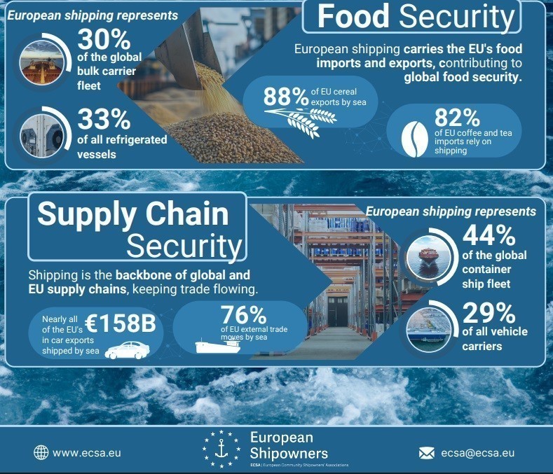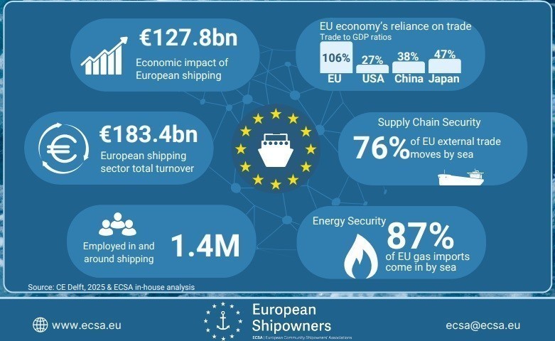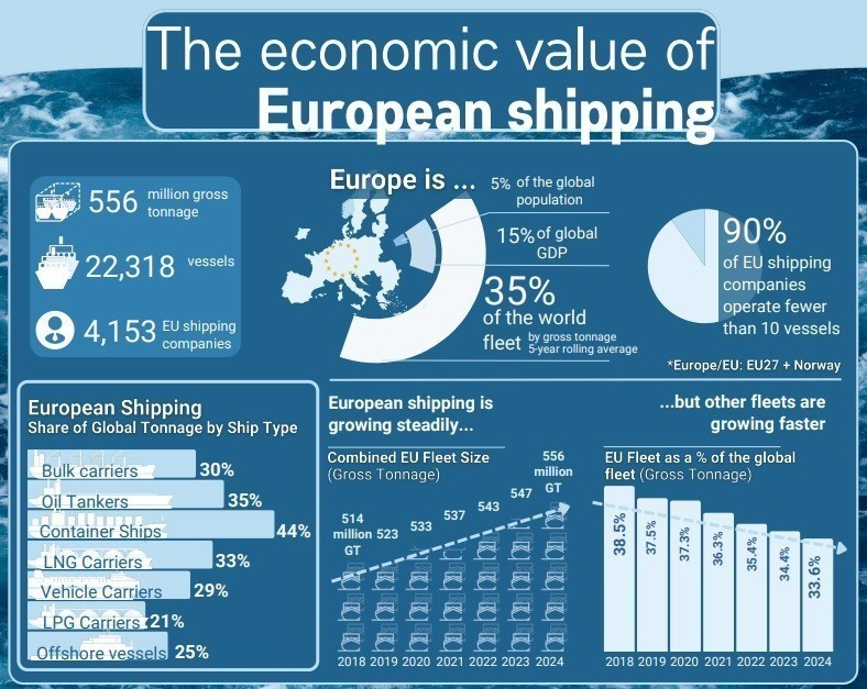 Παρά το γεγονός ότι η ΕΕ αντιπροσωπεύει περίπου το 15% του παγκόσμιου ΑΕΠ, ο Ευρωπαϊκός ναυτιλιακός στόλος είναι από τους μεγαλύτερους στον κόσμο, αντιπροσωπεύοντας περίπου το 35% του παγκόσμιου στόλου σε όρους παγκόσμιου τονάζ σε όλα τα τμήματα, σύμφωνα με τη μελέτη της CE Delft. Η Ευρωπαϊκή Ναυτιλία ελέγχει το 30% των παγκόσμιων φορτηγών πλοίων, το 44% των πλοίων μεταφοράς εμπορευματοκιβωτίων, το 35% των δεξαμενόπλοιων και το 33% των LNG carriers, καθιστώντας την ηγετική δύναμη στο παγκόσμιο εμπόριο.