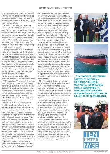Όπως τονίζεται στο αφιέρωμα, το όραμα της TEN για την επόμενη δεκαετία είναι σαφές: ασφαλής, αποδοτική και βιώσιμη ναυτιλία, με σεβασμό στο περιβάλλον, στους ανθρώπους και στις ανάγκες της παγκόσμιας οικονομίας