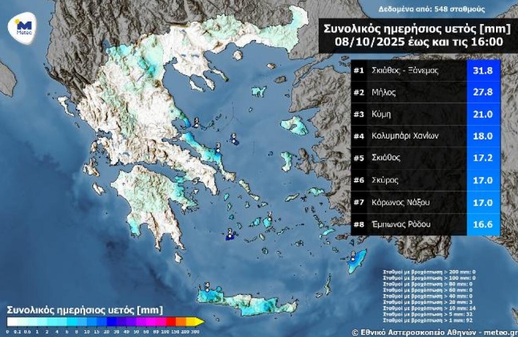 Σε νησιωτικά τμήματα του Αιγαίου και σε περιοχές της ανατολικής ηπειρωτικής χώρας εντοπίζονται οι σημαντικότερες βροχοπτώσεις της Τετάρτης 08/10 έως τις 16:00 το απόγευμα. Στον χάρτη της εικόνας που ακολουθεί παρουσιάζεται η κατανομή του αθροιστικού υετού έως τις 16:00, σύμφωνα με το δίκτυο αυτόματων μετεωρολογικών σταθμών του meteo.gr / Εθνικού Αστεροσκοπείου Αθηνών, καθώς και οι 8 σταθμοί του δικτύου που κατέγραψαν τα μεγαλύτερα ύψη. Το μεγαλύτερο ύψος βροχής στη χώρα έχει καταγραφεί στον Ξάνεμο Σκιάθου και είναι ίσο με 31,8 χιλιοστά.