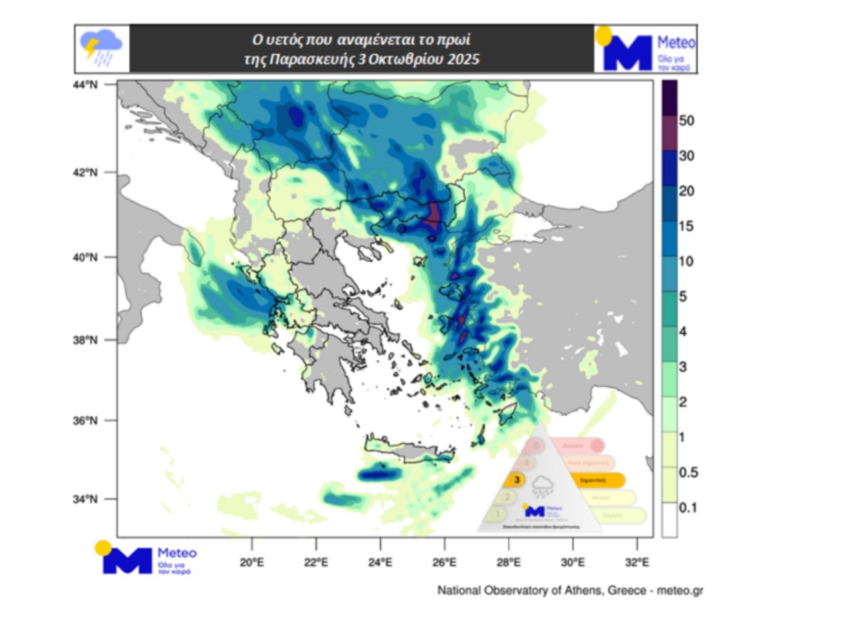 Στους χάρτες που ακολουθούν παρουσιάζεται ο υετός που αναμένεται τις πρώτες ώρες της Παρασκευής 3/10 και το πρωί της Παρασκευής: