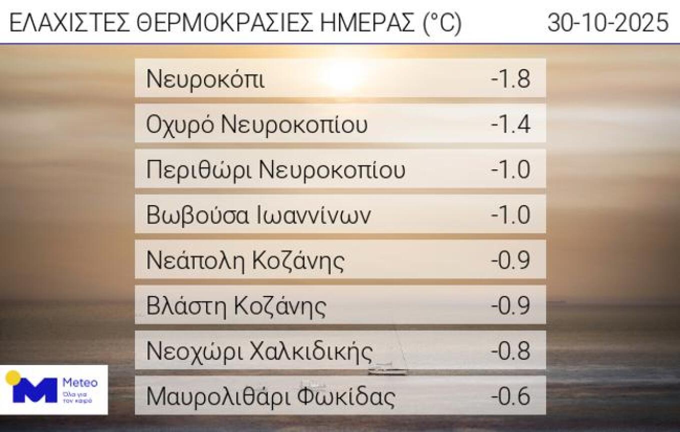 Χαμηλές θερμοκρασίες σημειώθηκαν τις πρωινές ώρες της Πέμπτης 30/10 στα ηπειρωτικά και ιδιαίτερα σε τμήματα της Μακεδονίας και της Ηπείρου, όπου ο υδράργυρος έπεσε κάτω από το 0.