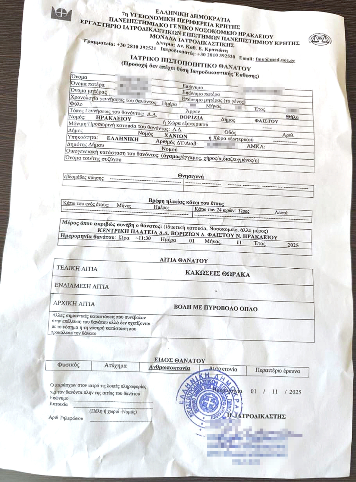 Το έγγραφο, που φέρει την υπογραφή της αναπληρώτριας προϊσταμένης της Ιατροδικαστικής Υπηρεσίας Κρήτης Ελένης Κρασανάκη, αναφέρει ρητά ότι η αιτία θανάτου είναι «κακώσεις θώρακα από βολή με πυροβόλο όπλο», ενώ ως είδος θανάτου προσδιορίζεται «ανθρωποκτονία».