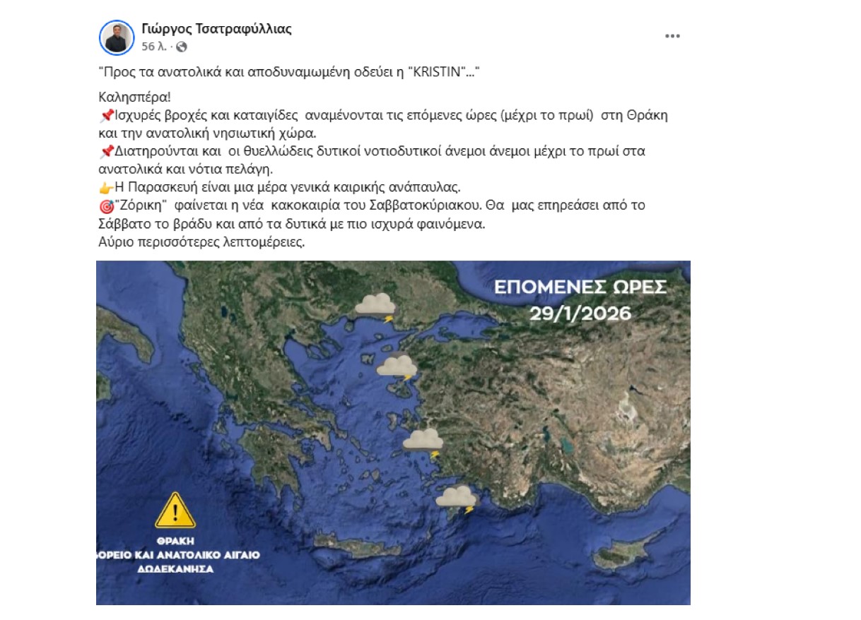 «”Ζόρικη” φαίνεται η νέα κακοκαιρία του Σαββατοκύριακου. Θα μας επηρεάσει από το Σάββατο το βράδυ και από τα δυτικά με πιο ισχυρά φαινόμενα», αναφέρει ο μετωρολόγος Γιώργος Τσατραφύλλιας. Από την πλευρά της η Νικολέτα Ζιακοπούλου μιλά για ενδείξεις πως θα έρθει νέα κακοκαιρία από την Κυριακή με σύστημα που θα φέρει βροχοπτώσεις κυρίως στα νότια, Πελοπόννησο, Κρήτη, Αιγαίο.