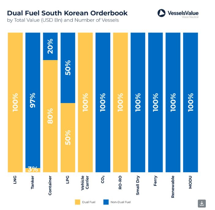 Η τάση για πλοία διπλού καυσίμου είναι ιδιαίτερα έντονη. Από τα πλοία που παραγγέλθηκαν στη Νότια Κορέα, περίπου το 37% είναι εξοπλισμένα με δυνατότητες διπλού καυσίμου, αντιπροσωπεύοντας αξία 71,4 δισ. δολαρίων. Η μεγαλύτερη συγκέντρωση διπλού καυσίμου παρατηρείται στον τομέα των κοντέινερ, όπου το 80% των παραγγελιών είναι για πλοία αυτού του τύπου. Επίσης, περίπου το 50% των LPG παραγγελιών (64 πλοία) θα κατασκευαστούν ως διπλού καυσίμου.