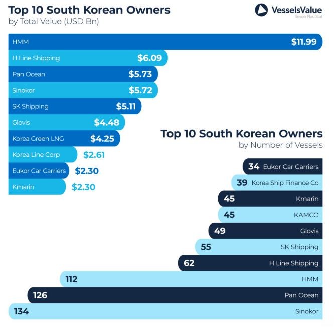 Η HMM είναι ο πιο πολύτιμος ιδιοκτήτης στη Νότια Κορέα με στόλο αξίας 11,9 δισ. δολαρίων και 112 πλοία, εκ των οποίων τα περισσότερα είναι Bulkers, Tankers, Containers, LNG και Vehicle Carriers. Ακολουθεί η H-Line Shipping με αξία στόλου 6,09 δισ. δολαρίων και 62 πλοία, ενώ η Pan Ocean έχει αξία στόλου 5,73 δισ. δολαρίων και 126 πλοία. Η Sinokor, παρά την ίδια αξία στόλου, έχει τον μεγαλύτερο αριθμό πλοίων, με 134 συνολικά.
