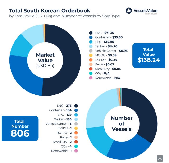Σύμφωνα με την VESON Nautical η ναυτιλιακή βιομηχανία της Νότιας Κορέας παραμένει μία από τις ηγέτιδες ναυπηγικές δυνάμεις παγκοσμίως με ένα βιβλίο παραγγελιών που ξεπερνά τα 138 δισεκατομμύρια δολάρια, με τον τομέα του LNG να κυριαρχεί, αντιπροσωπεύοντας το 52% της συνολικής αξίας των παραγγελιών. Οι παραγγελίες αυτές περιλαμβάνουν σημαντικούς τομείς, όπως οι LNG carriers, οι Tankers και τα Containers, ενώ η τάση προς τα πλοία διπλού καυσίμου είναι σαφής, ιδιαίτερα στους τομείς των κοντέινερ και LPG.