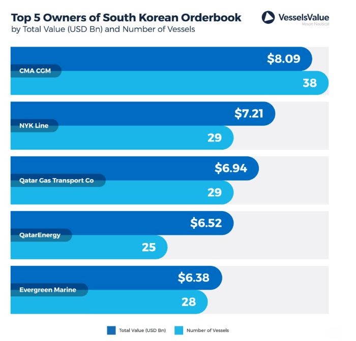 Οι κορυφαίοι πλοιοκτήτες της Νότιας Κορέας, όπως η CMA CGM, η NYK και η Qatar Energy, παίζουν καθοριστικό ρόλο στην ενίσχυση της ζήτησης για μεγάλα LNG και κοντέινερ πλοία. Η CMA CGM, για παράδειγμα, έχει παραγγείλει 38 πλοία κοντέινερ σε τομείς όπως ULCV και New Panamax, συνολικής αξίας 8,09 δισ. δολαρίων. Από την άλλη, η NYK έχει παραγγείλει 26 μεγάλα LNG πλοία αξίας 7,21 δισ. δολαρίων.