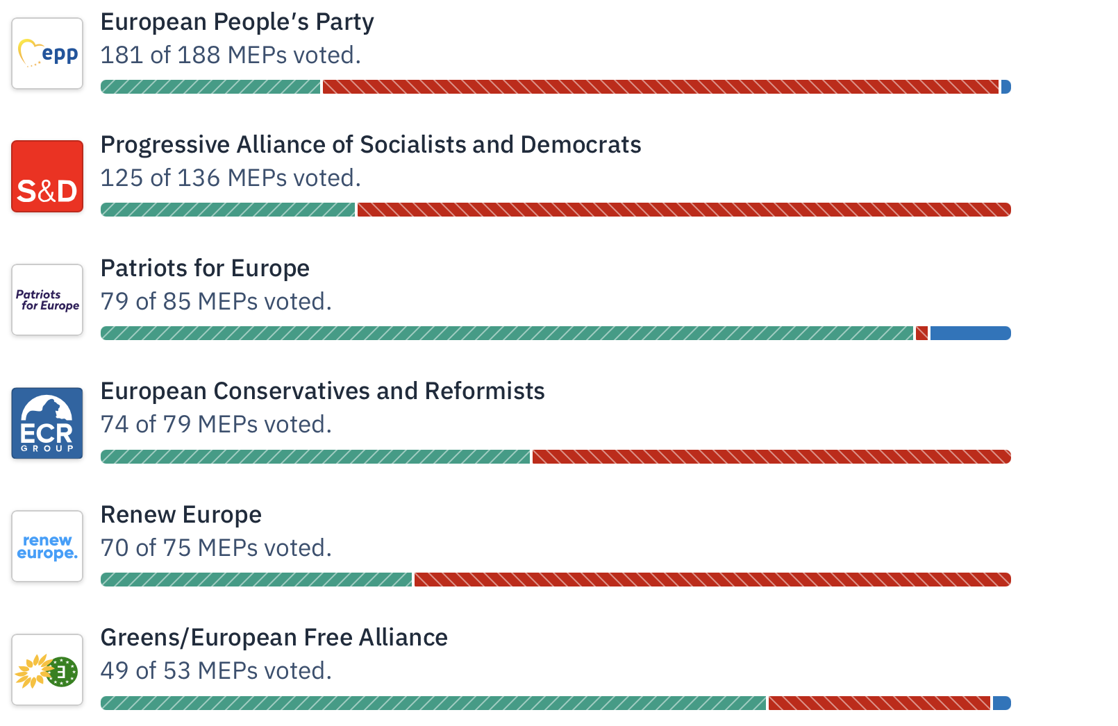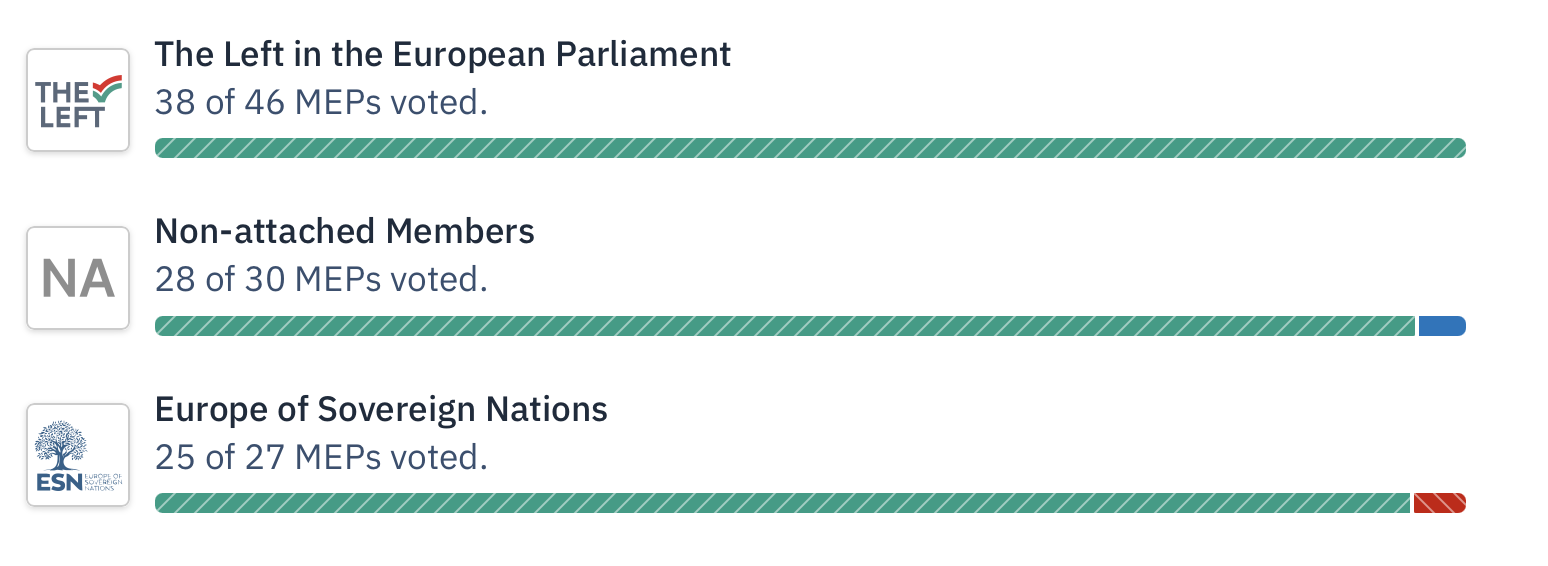 -Από την Ευρωομάδα Patriots for Europe, που συμμετέχουν μεταξύ άλλων ο Ζορντάν Μπαρντελά και η Αφροδίτη Λατινοπούλο, ψήφισαν 79/85 και η συντριπτική πλειοψηφία ψήφισε υπέρ.