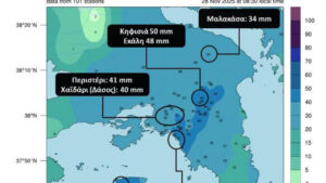 Ειδικότερα, όπως αποτυπώνεται σε χάρτη του Εθνικού Αστεροσκοπείου Αθηνών/meteo.gr στο Φάληρο καταγράφηκαν 52 χιλιοστά βροχής ενώ σε ‘Αλιμο και Κηφισιά 50.