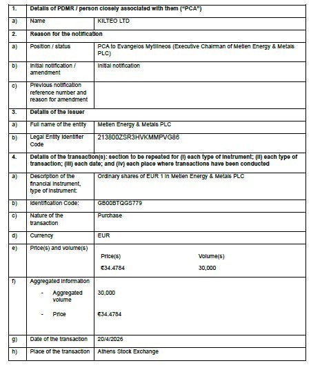 Υπενθυμίζεται ότι λίγες ημέρες νωρίτερα, την Τετάρτη 14 Απριλίου, είχε προηγηθεί νέα τοποθέτηση του προέδρου και διευθύνοντος συμβούλου του ομίλου, Ευάγγελου Μυτιληναίου, σε μετοχές της Metlen. Συγκεκριμένα, ο Ευάγγελος Μυτιληναίος απέκτησε τη Μεγάλη Παρασκευή (10/4) 50.000 μετοχές στο London Stock Exchange, με τιμή 32,5918 ευρώ ανά μετοχή, ανεβάζοντας τη συνολική αξία της συναλλαγής πάνω από τα 1,6 εκατ. ευρώ.