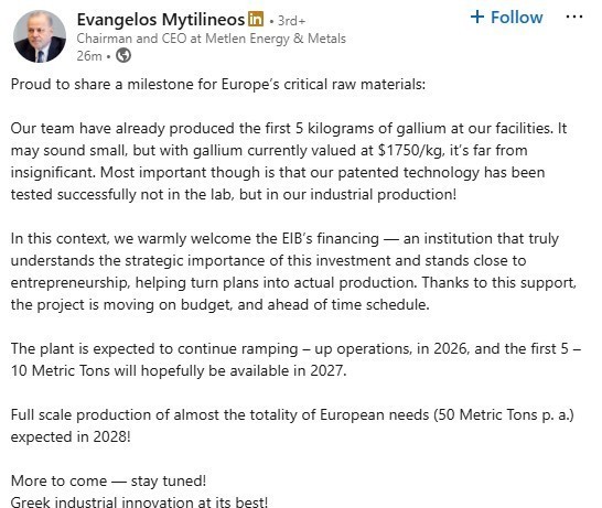 Την ολοκλήρωση της παραγωγής των πρώτων πέντε κιλών γαλλίου από την Metlen γνωστοποίησε, μέσω ανάρτησής του στο LinkedIn, ο Ευάγγελος Μυτιληναίος.