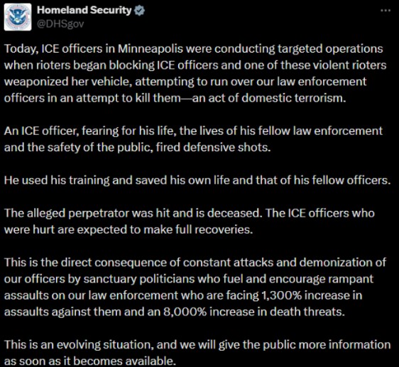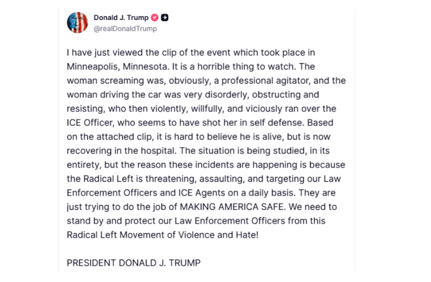 Κατά τον πρόεδρο των ΗΠΑ «ο λόγος για τον οποίο συμβαίνουν αυτά τα περιστατικά είναι επειδή η ριζοσπαστική αριστερά απειλεί, επιτίθεται και στοχεύει καθημερινά τους αξιωματικούς επιβολής του νόμου και τους πράκτορες της ICE. Αυτοί απλώς προσπαθούν να κάνουν τη δουλειά τους, να ΚΑΝΟΥΝ ΤΗΝ ΑΜΕΡΙΚΗ ΑΣΦΑΛΗ. Πρέπει να σταθούμε στο πλευρό των αξιωματικών επιβολής του νόμου και να τους προστατεύσουμε από αυτό το ριζοσπαστικό αριστερό κίνημα βίας και μίσους!».