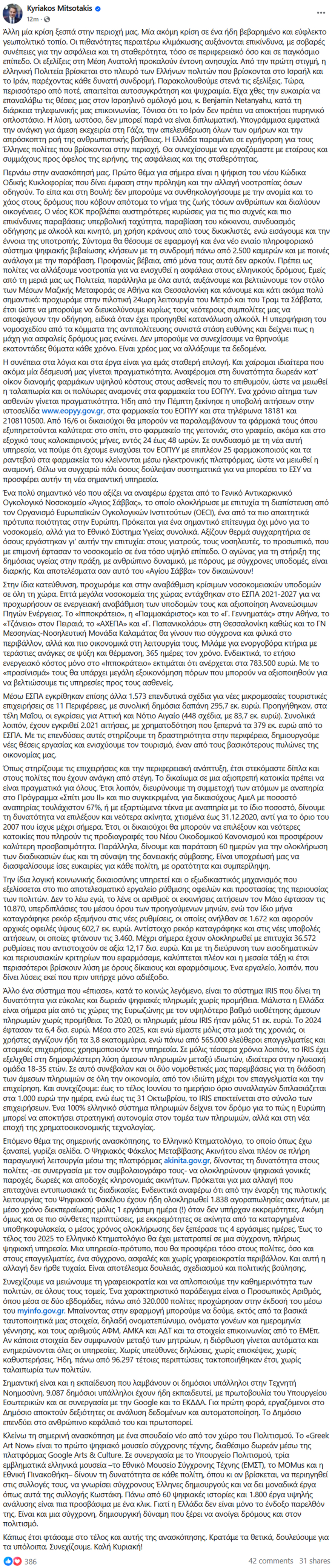 Περνάω στην ανασκόπησή μας. Πρώτο θέμα για σήμερα είναι η ψήφιση του νέου Κώδικα Οδικής Κυκλοφορίας που δίνει έμφαση στην πρόληψη και την αλλαγή νοοτροπίας όσων οδηγούν. Το είπα και στη Βουλή: δεν μπορούμε να συνθηκολογήσουμε με την ανομία και το χάος στους δρόμους που κόβουν απότομα το νήμα της ζωής τόσων ανθρώπων και διαλύουν οικογένειες. Ο νέος ΚΟΚ προβλέπει αυστηρότερες κυρώσεις για τις πιο συχνές και πιο επικίνδυνες παραβάσεις: υπερβολική ταχύτητα, παραβίαση του κόκκινου, συνδυασμός οδήγησης με αλκοόλ και κινητό, μη χρήση κράνους από τους δικυκλιστές, ενώ εισάγουμε και την έννοια της υποτροπής. Σύντομα θα θέσουμε σε εφαρμογή και ένα νέο ενιαίο πληροφοριακό σύστημα ψηφιακής βεβαίωσης κλήσεων με τη συνδρομή πάνω από 2.500 καμερών και με ποινές ανάλογα με την παράβαση. Προφανώς βέβαια, από μόνα τους αυτά δεν αρκούν. Πρέπει ως πολίτες να αλλάξουμε νοοτροπία για να ενισχυθεί η ασφάλεια στους ελληνικούς δρόμους. Εμείς από τη μεριά μας ως Πολιτεία, παράλληλα με όλα αυτά, αυξάνουμε και βελτιώνουμε τον στόλο των Μέσων Μαζικής Μεταφοράς σε Αθήνα και Θεσσαλονίκη και κάνουμε και κάτι ακόμα πολύ σημαντικό: προχωράμε στην πιλοτική 24ωρη λειτουργία του Μετρό και του Τραμ τα Σάββατα, έτσι ώστε να μπορούμε να διευκολύνουμε κυρίως τους νεότερους συμπολίτες μας να αποφεύγουν την οδήγηση, ειδικά όταν έχει προηγηθεί κατανάλωση αλκοόλ. Η υπερψήφιση του νομοσχεδίου από τα κόμματα της αντιπολίτευσης συνιστά στάση ευθύνης και δείχνει πως η μάχη για ασφαλείς δρόμους μας ενώνει. Δεν μπορούμε να συνεχίσουμε να θρηνούμε εκατοντάδες θύματα κάθε χρόνο. Είναι χρέος μας να αλλάξουμε τα δεδομένα.