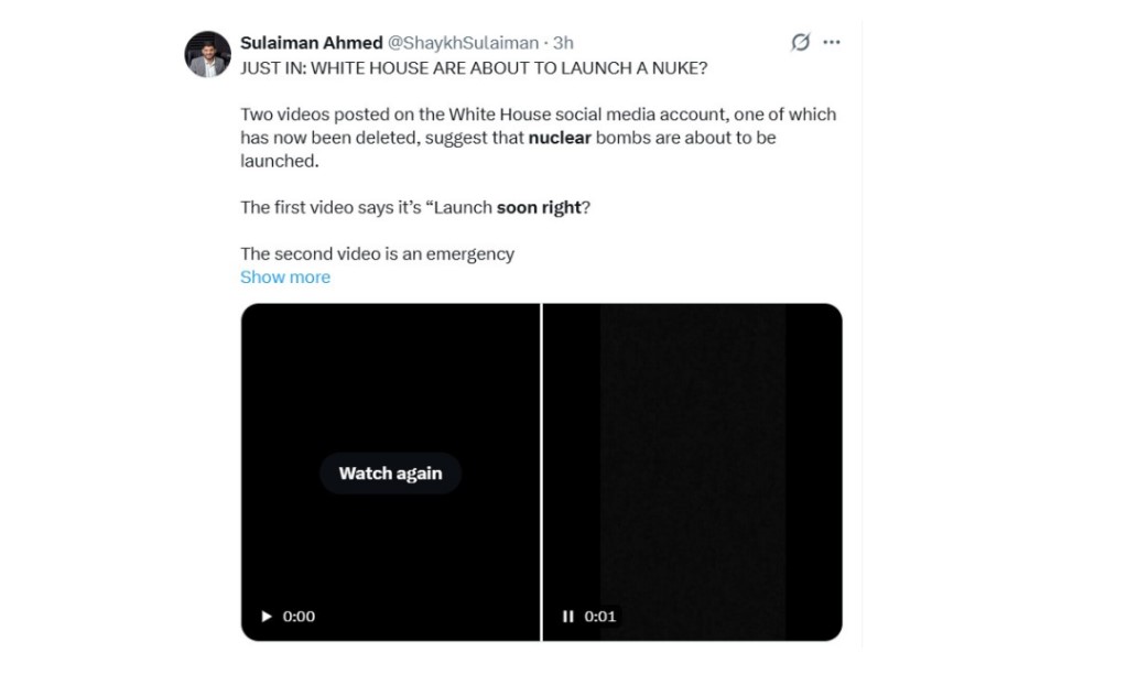 Strange video posted earlier by the White House on X, possibly accidentally, in which a female individual, potentially Press Secretary Karoline Leavitt, can be heard saying, “It’s launching soon right?” pic.twitter.com/D3XUhUNxAQ