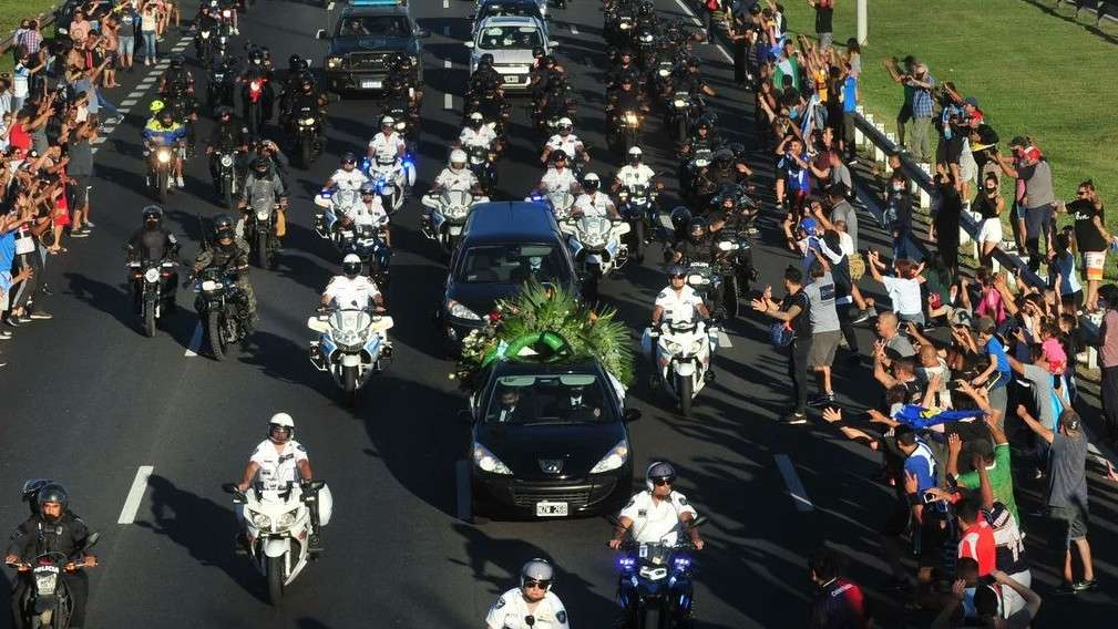 Χιλιάδες οπαδοί με φανέλες του Ντιέγκο με το 10 από την εθνική Αργεντινής, την Μπόκα, τη Νιούελς και την Αρχεντινός συνόδευσαν τη νεκροφόρα, ο οδηγός της οποίας μπερδεύτηκε και βγήκε σε άλλη έξοδο με αποτέλεσμα να καθυστερήσει λίγο η άφιξη.