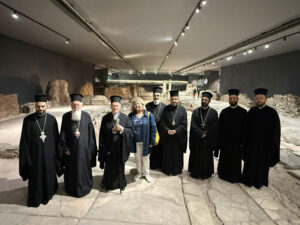 Ο Πατριάρχης και η συνοδεία του ενημερώθηκαν από την Προϊσταμένη Εφορείας Αρχαιοτήτων Πόλης Θεσσαλονίκης, αρχαιολόγο, Ελισάβετ Τσιγαρίδα για τον αρχαιολογικό χώρο εντός του σταθμού, ο οποίος  περιλαμβάνει τμήματα παλαιότερων οικοδομικών φάσεων της Θεσσαλονίκης, από τους ελληνιστικούς ακόμη χρόνους και και από τις επόμενες ιστορικές περιόδους. Ο κ. Βαρθολομαίος και η συνοδεία του περιηγήθηκαν στον αρχαίο δρόμο και στην πλακόστρωτη πλατεία του αρχαιολογικού χώρου, ενώ η κα Τσιγαρίδα τους ενημέρωνε για τις φάσεις κατασκευής του αρχαιολογικού έργου και για τις αρχαιότητες, που κοσμούν τον σταθμό του Μετρό.