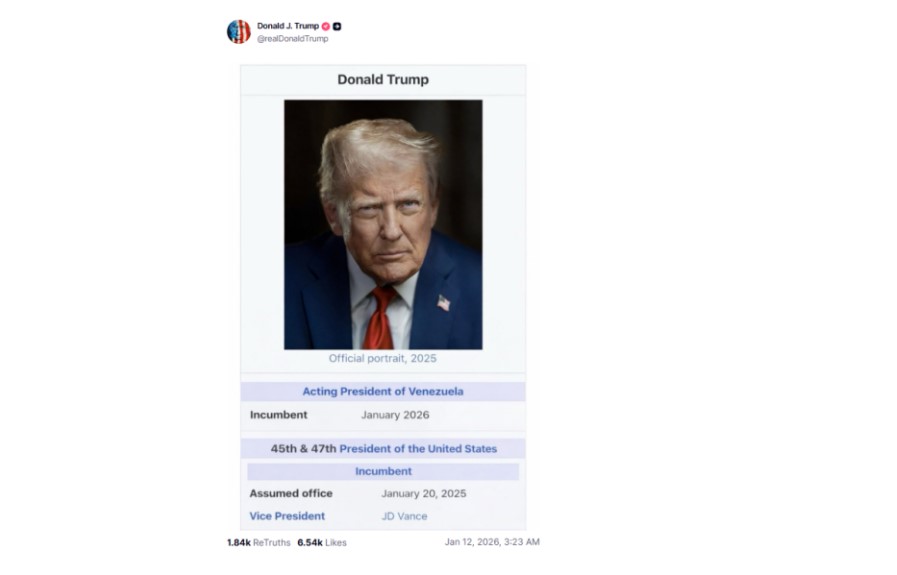 Αίσθηση και έντονες αντιδράσεις προκάλεσε ανάρτηση του Αμερικανού προέδρου Ντόναλντ Τραμπ στο Truth Social, στην οποία εμφανίζεται σε φωτογραφία με τον τίτλο «Acting President of Venezuela», αυτοχαρακτηριζόμενος δηλαδή ως «εν ενεργεία πρόεδρος της Βενεζουέλα», χρησιμοποιώντας μάλιστα το επίσημο προεδρικό του πορτρέτο.