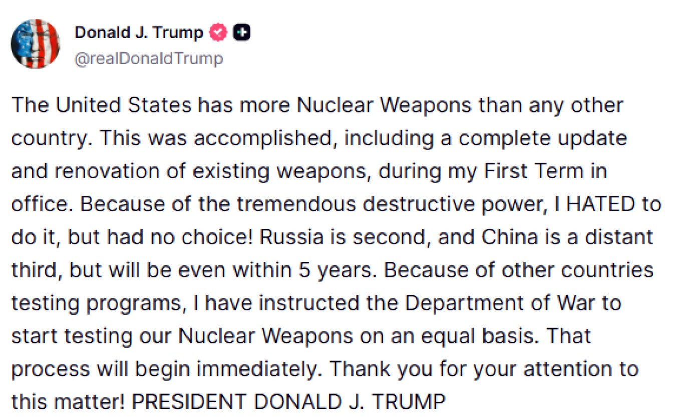 «Λόγω της τρομερής, καταστροφικής ισχύος τους, ΑΠΕΧΘΑΝΟΜΟΥΝ να το κάνω αλλά δεν είχα άλλη επιλογή!», προσθέτει στο post του και καταλήγει: «Εξαιτίας των δοκιμών από άλλες χώρες, έδωσα εντολή στο υπουργείο Πολέμου (σ.σ. όπως έχει μετονομαστεί το υπουργείο Άμυνας των ΗΠΑ) να αρχίσει δοκιμές των πυρηνικών μας όπλων επί ίσοις όροις. Αυτή η διαδικασία θα ξεκινήσει αμέσως».