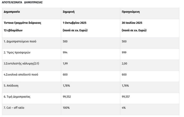 Σήμερα διενεργήθηκε δημοπρασία εντόκων γραμματίων διάρκειας 13 εβδομάδων, ύψους 500 εκατομμυρίων ευρώ. Η απόδοση διαμορφώθηκε στο 1,78%. Υποβλήθηκαν συνολικές προσφορές ύψους 994 εκατομμυρίων Ευρώ, που υπερκάλυψαν το ζητούμενο ποσό κατά 1,99 φορές.