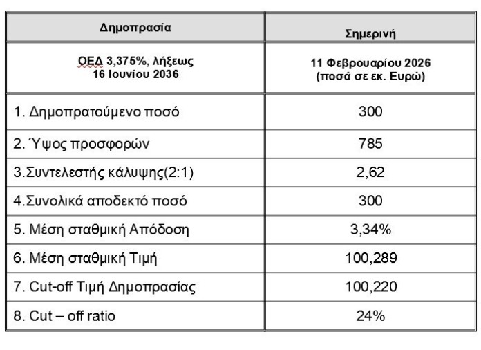 Η δημοπρασία πραγματοποιήθηκε μέσω των Βασικών Διαπραγματευτών Αγοράς (Primary Dealers) και η ημερομηνία διακανονισμού είναι η Τετάρτη 18 Φεβρουαρίου 2026.