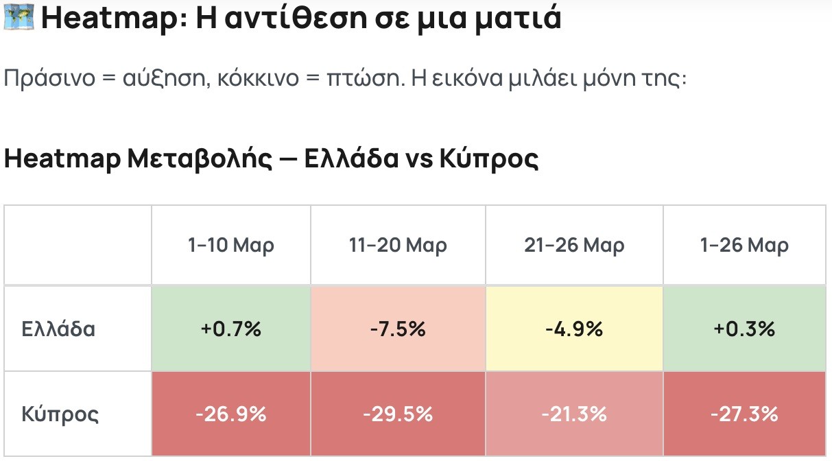 Αναλύοντας την εικόνα ανά εβδομάδα, για το πρώτο δεκαήμερο του Μαρτίου η Κύπρος δείχνει σοβαρή, άμεση και όχι σταδιακή πτώση (−26,9%), ενώ η Ελλάδα παραμένει σταθερή (+0,7%). Στο δεύτερο δεκαήμερο 11- 20 Μαρτίου, «η Ελλάδα υποχωρεί ελαφρά (−7,5%) – πιθανώς φυσιολογική διακύμανση, αφού ο απόλυτος αριθμός κρατήσεων παραμένει πολύ υψηλός, ενώ η Κύπρος βυθίζεται περαιτέρω στο −29,5%, τη χειρότερη επίδοση σε οποιαδήποτε περίοδο», όπως επισημαίνεται σχετικά. «Στο κλείσιμο του μήνα (σ.σ. με στοιχεία έως και τις 26 Μαρτίου) η Ελλάδα παραμένει πτωτική στο μείον 4,9%, μέσα στα πλαίσια φυσιολογικής διακύμανσης, ενώ η Κύπρος βρίσκεται στο μείον 21,3%, ελαφρώς βελτιωμένη αλλά ακόμα σημαντικά αρνητική», αναφέρεται στην έρευνα.