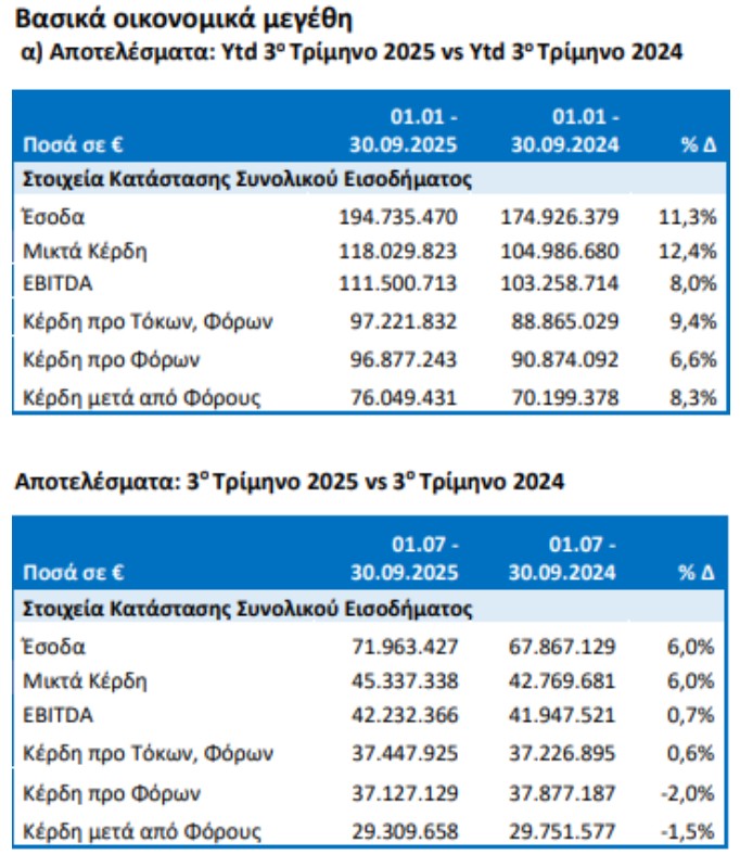 Συγκεκριμένα, η εταιρεία ανακοίνωσε ενίσχυση κατά 8,3% στα καθαρά κέρδη του 9μήνου που διαμορφώθηκαν σε 76.049.431 ευρώ, σημαντική βελτίωση εσόδων κατά 11,3% στα 194.735.470 ευρώ, αυξημένα κατά 12,4% μεικτά κέρδη που διαμορφώθηκαν σε 118.029.823 εκατ. και EBITDA αυξημένα κατά 8% στα 111.500.713 1ευρώ.