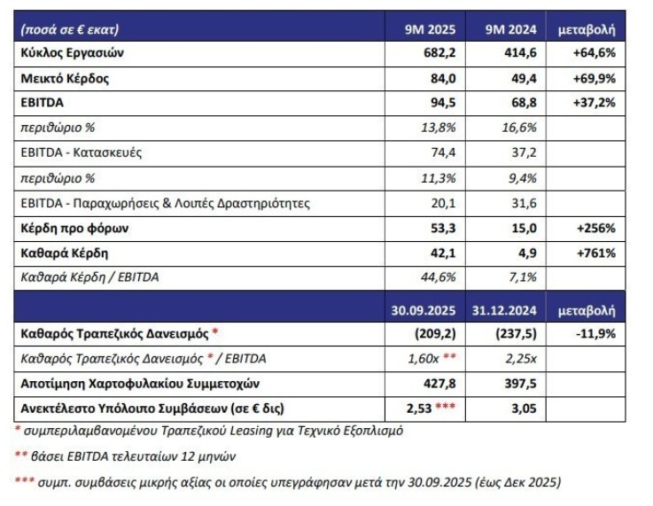 Τα κέρδη προ φόρων, χρηματοοικονομικών εξόδων και αποσβέσεων (ΕΒΙΤDA) του Ομίλου ανήλθαν σε €94,5 εκατομμύρια στο εννεάμηνο του 2025 έναντι €68,8 εκατομμυρίων στο συγκρίσιμο εννεάμηνο του προηγούμενου έτους, κυρίως λόγω της αύξησης του EBITDA του κλάδου της κατασκευής, ως αποτέλεσμα της εκτέλεσης έργων τα οποία προσφέρουν υψηλότερα περιθώρια κέρδους.