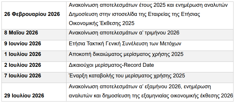 Η Εταιρεία διατηρεί το δικαίωμα να μεταβάλλει τις παραπάνω ημερομηνίες, αφού ενημερώσει έγκαιρα το επενδυτικό κοινό. Σημειώνεται ότι η διανομή μερίσματος και οι ανωτέρω σχετικές αναφερθείσες ημερομηνίες τελούν υπό την έγκριση του Διοικητικού Συμβουλίου και της Ετήσιας Τακτικής Γενικής Συνέλευσης των Μετοχών της Εταιρείας.