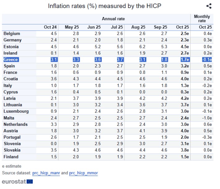 Ο ετήσιος πληθωρισμός στην Ελλάδα επιβραδύνθηκε περαιτέρω, φτάνοντας στο 1,7% τον Οκτώβριο, από 1,8% τον Σεπτέμβριο, σύμφωνα με στοιχεία της Eurostat. Σε μηνιαία βάση, οι τιμές καταναλωτή μειώθηκαν κατά 0,1%.