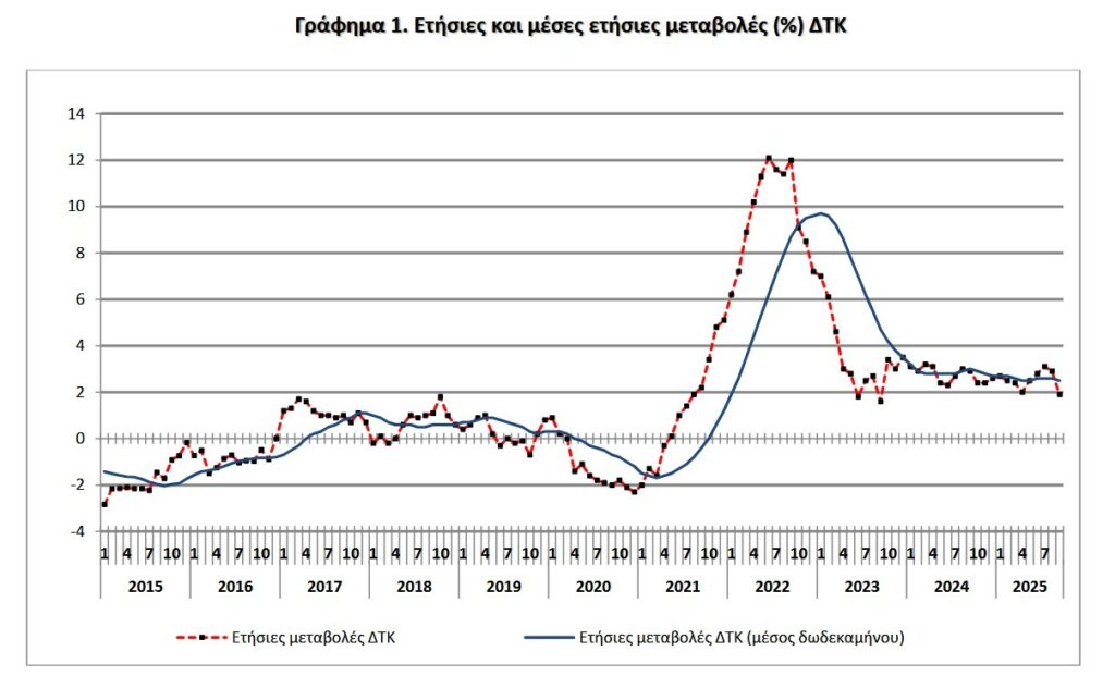 Ο μέσος ΔΤΚ του δωδεκαμήνου Οκτωβρίου 2024 – Σεπτεμβρίου 2025 αυξήθηκε κατά 2,5% σε σχέση με τον αντίστοιχο δείκτη της προηγούμενης περιόδου, έναντι αύξησης 3,0% που είχε καταγραφεί προηγουμένως.