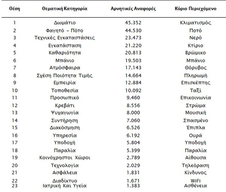 Στην πρώτη θέση με 45 χιλ. αναφορές βρέθηκε η κατηγορία Δωμάτιο με λέξη-κλειδί τον «Κλιματισμό». Στην συνέχεια ακολούθησαν οι κατηγορίες Φαγητό-Ποτό με 45 χιλ. αναφορές και λέξη-κλειδί «Ποτό».