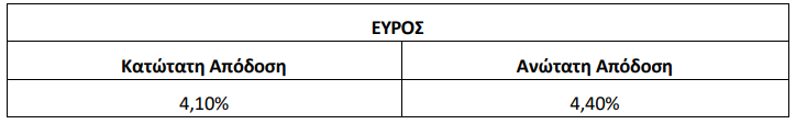 Το εύρος απόδοσης καθορίστηκε μεταξύ 4,1% και 4,4%, με την τιμή διάθεσης ανά ομολογία στα 1.000 ευρώ.