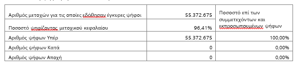 Συμμετείχε 1 μέτοχος που εκπροσωπεί 55.372.675 κοινές ονομαστικές μετοχές (55.372.675 δικαιώματα ψήφου) επί συνόλου 57.434.884 κοινών ονομαστικών μετοχών (και 57.434.884 δικαιωμάτων ψήφου), ήτοι ποσοστό 96,41% του καταβεβλημένου μετοχικού κεφαλαίου.