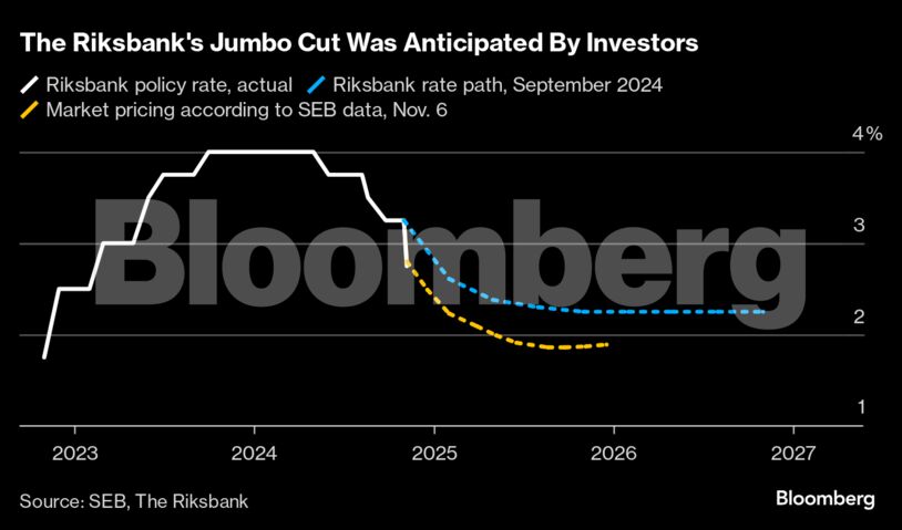 Ειδικότερα, η Riksbank μείωσε το βασικό επιτόκιο στο 2,75% και δήλωσε ότι παρόλο που η αβεβαιότητα είναι πιο έντονη απ’ ό,τι συνήθως μετά τις εκλογές στις ΗΠΑ, είναι πιθανές περαιτέρω μειώσεις τον Δεκέμβριο και το πρώτο εξάμηνο του επόμενου έτους. Όλοι εκτός από τρεις εκ των 21 οικονομολόγων που συμμετείχαν σε έρευνα του Bloomberg προέβλεψαν σωστά το μέγεθος της μείωσης.