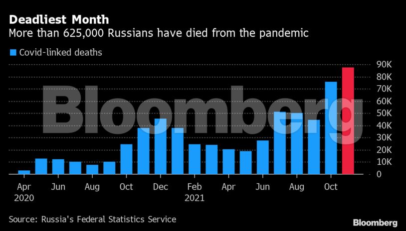 «Μαύρος» ήταν ο Νοέμβριος για τη Ρωσία. Με 87.527 θανάτους από την πανδημία σύμφωνα με επίσημα δεδομένα, ακόμα και ο Πρόεδρος Πούτιν χαρακτήρισε τον ιό ως απειλητικό για το μέλλον της χώρας. Η Ρωσία έχει καταγράψει 625.000 θανάτους από την αρχή της πανδημίας και βρίσκεται, πια, στη δεύτερη θέση της κατάταξης πίσω από τις ΗΠΑ.