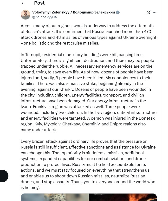 «Στην Τερνοπίλ, πολυκατοικίες εννέα ορόφων επλήγησαν (…) δεκάδες άνθρωποι τραυματίστηκαν και δυστυχώς εννέα άνθρωποι έχασαν τη ζωή τους», σημείωσε ο Βολοντίμιρ Ζελένσκι σε ανάρτησή του στα μέσα κοινωνικής δικτύωσης.
