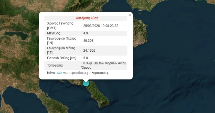 Σεισμός 4,9 Ρίχτερ σημειώθηκε το βράδυ της Τετάρτης (25/3) στο Άγιο Όρος.