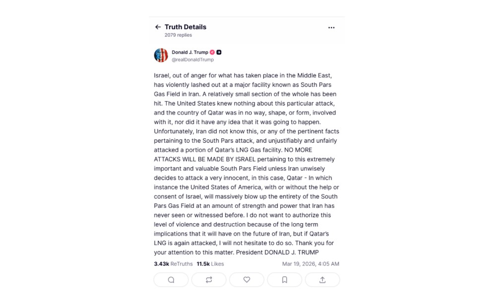 «Το Ισραήλ, από οργή για όσα συνέβησαν στη Μέση Ανατολή, επιτέθηκε με βία σε μια σημαντική εγκατάσταση γνωστή ως το πεδίο φυσικού αερίου South Pars στο Ιράν. Ένα σχετικά μικρό τμήμα του πεδίου χτυπήθηκε. Οι Ηνωμένες Πολιτείες δεν είχαν καμία γνώση για αυτήν την επίθεση και το Κατάρ δεν είχε καμία απολύτως εμπλοκή, ούτε γνώριζε ότι επρόκειτο να συμβεί. Δυστυχώς, το Ιράν δεν γνώριζε αυτό ή οποιαδήποτε από τα σχετικά γεγονότα που αφορούσαν την επίθεση στο South Pars και άδικα και αβάσιμα επιτέθηκε σε μια μέρος της εγκατάστασης LNG του Κατάρ.