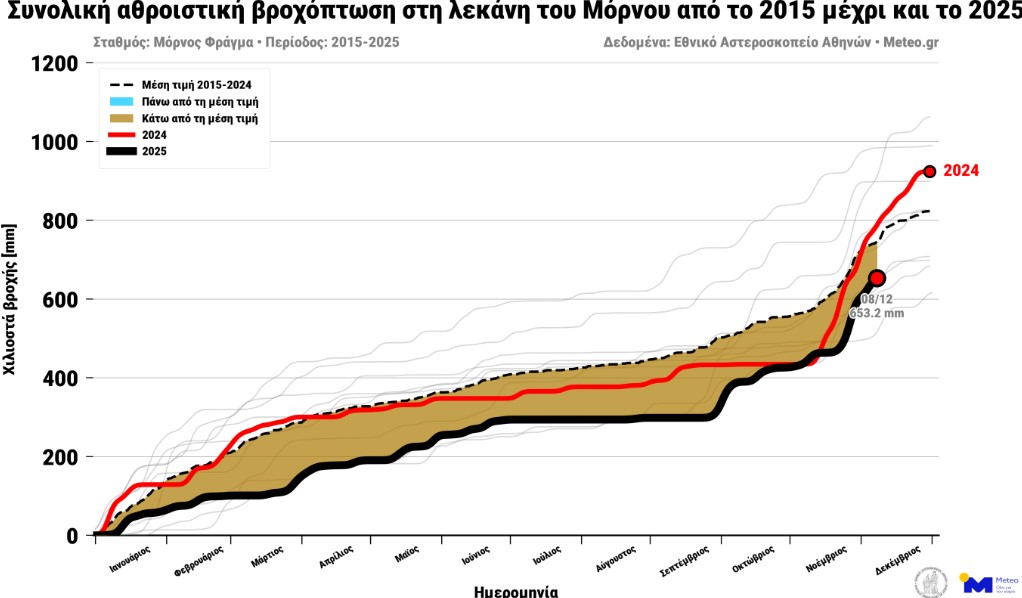 Στο Φράγμα Μόρνου έχουν καταγραφεί μέχρι στιγμής 653 χιλιοστά βροχής. Η μέση τιμή των προηγούμενων δέκα ετών για το ίδιο διάστημα υπολογίζεται περίπου στα 800 χιλιοστά.