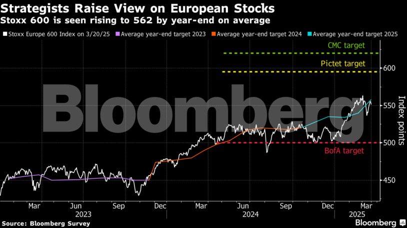 Σχεδόν οι μισοί από τους στρατηγικούς αναλυτές σε μηνιαία έρευνα του Bloomberg έχουν αυξήσει τις προβλέψεις τους για τον δείκτη Stoxx Europe 600 από τον περασμένο μήνα – όταν περίπου τα δύο τρίτα των στρατηγικών έβλεπαν καθοδική πορεία στο άμεσο μέλλον.