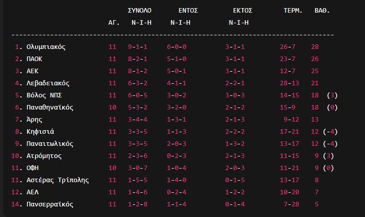 ΒΑΘΜΟΛΟΓΙΑ SUPER LEAGUE 2025/26 (με πλήρη στατιστικά)