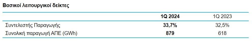 Όσον αφορά στο συντελεστή φόρτισης (load factor), αυτός διαμορφώθηκε σε 33,7% για το σύνολο του χαρτοφυλακίου κατά το πρώτο τρίμηνο του έτους, έναντι 32,5% για το πρώτο τρίμηνο του 2023, ενώ συγκεκριμένα για την Ελλάδα διαμορφώθηκε σε 33,3% έναντι 31,9%. Σε συνδυασμό με την αυξημένη εγκατεστημένη ισχύ, η παραγωγή ενέργειας αυξήθηκε κατά 42,2% και ανήλθε στις 879 GWh. Σημειώνεται ότι εξαιρώντας το έργο του Καφηρέα, η παραγωγή ενέργειας αυξήθηκε κατά 6,2%.