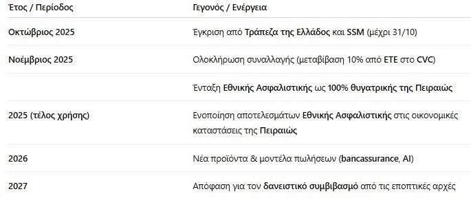 Η ολοκλήρωση της συναλλαγής προβλέπει την απόκτηση του 10% της Εθνικής Ασφαλιστικής από το CVC και την εν συνεχεία μεταβίβασή του στην Τράπεζα Πειραιώς. Το ποσοστό αυτό το οποίο στην παρούσα φάση κατέχει ακόμη η Εθνική Τράπεζα αναμένεται μετά από την ολοκλήρωση των διαπραγματεύσεων με το fund να το μεταβιβάσει ως έχει σχετική υποχρέωση, αφού εκπληρωθούν ορισμένοι όροι ως μέρος της αρχικής συμφωνίας της Εθνικής Τράπεζας με το CVC.