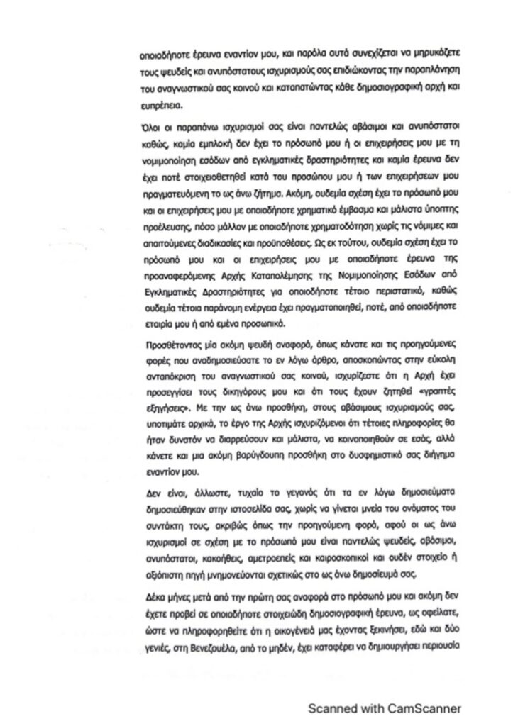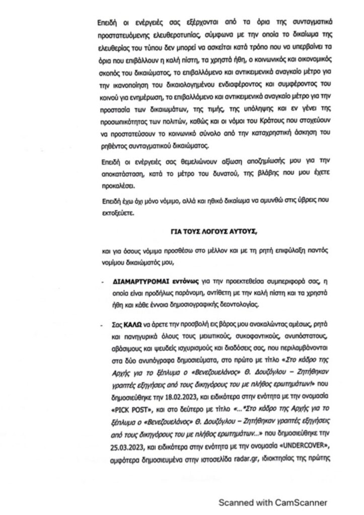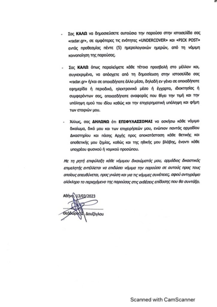 Το radar δημοσιεύσει αυτούσιο το εξώδικο προς ενημέρωση των αναγνωστών του.