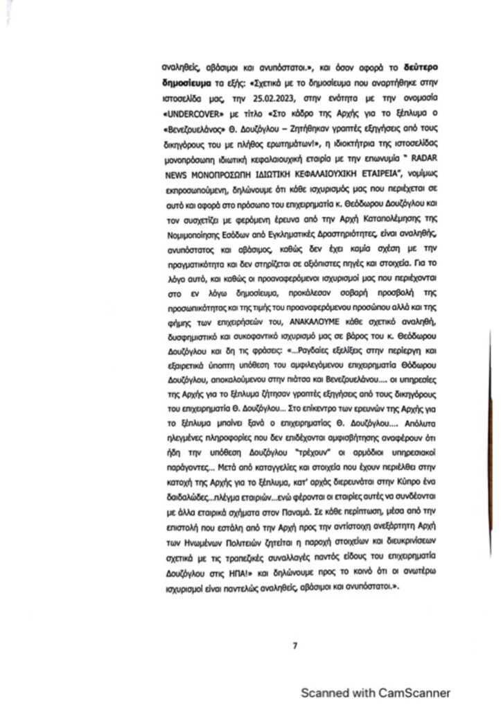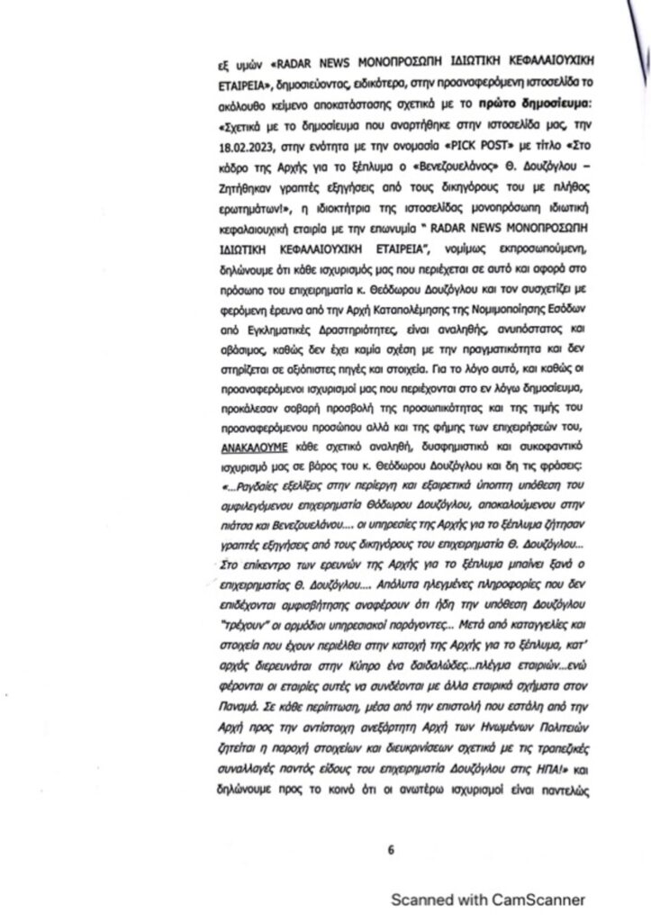 Εξώδικό προς το radar απέστειλε ο Θεόδωρος Δουζόγλου με αφορμή το δημοσίευμα «Στο κάδρο της Αρχής για το ξέπλυμα ο «Βενεζουελάνος» Θ. Δουζόγλου – Ζητήθηκαν γραπτές εξηγήσεις από τους δικηγόρους του με πλήθος ερωτημάτων».